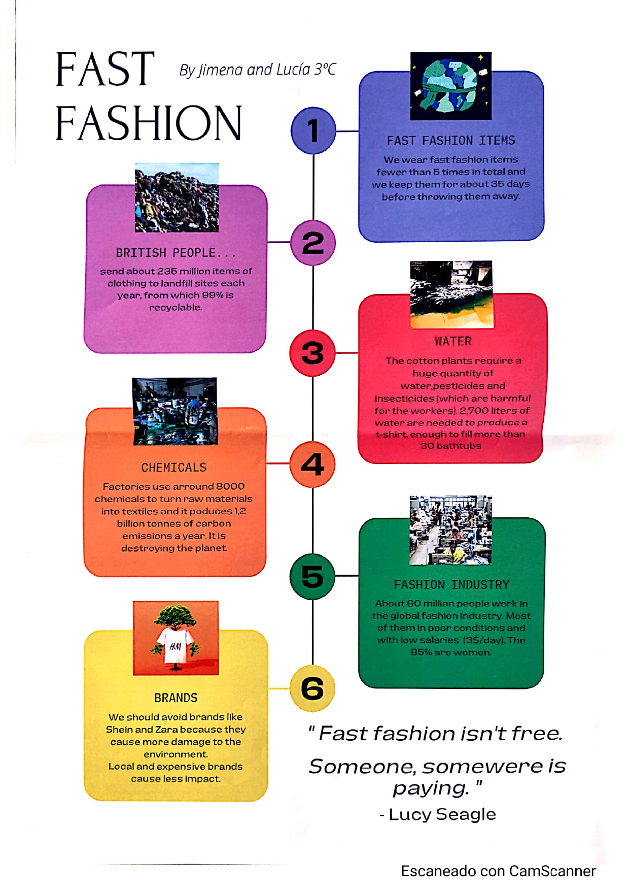 For a couple of weeks, our students from 3rd and 4th ESO have been learning and talking about different aspects related to the fashion industry, like the impact on workers and the environment. They have been involved in different activities like defining “fast fashion”, analysing where their clothes come from or reflecting upon the environmental consequences and the human resources that are needed to create garments, and they have created posters to raise awareness about the environmental impact of the fashion industry. This way they have reflected upon the need to take personal responsibility when buying clothes, the effects of over-consumption, the easy changes we can make to be sustainable and the urge to improve safety and working conditions in the fashion industry. Here are some examples of their works: